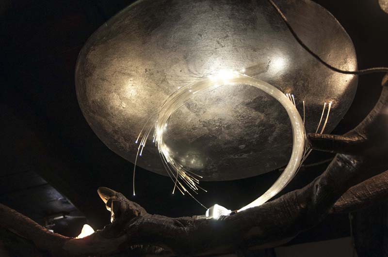 | Fascio di luce con fibre ottiche a lambire un pseudo pianeta in gesso lavorato con foglia argento |