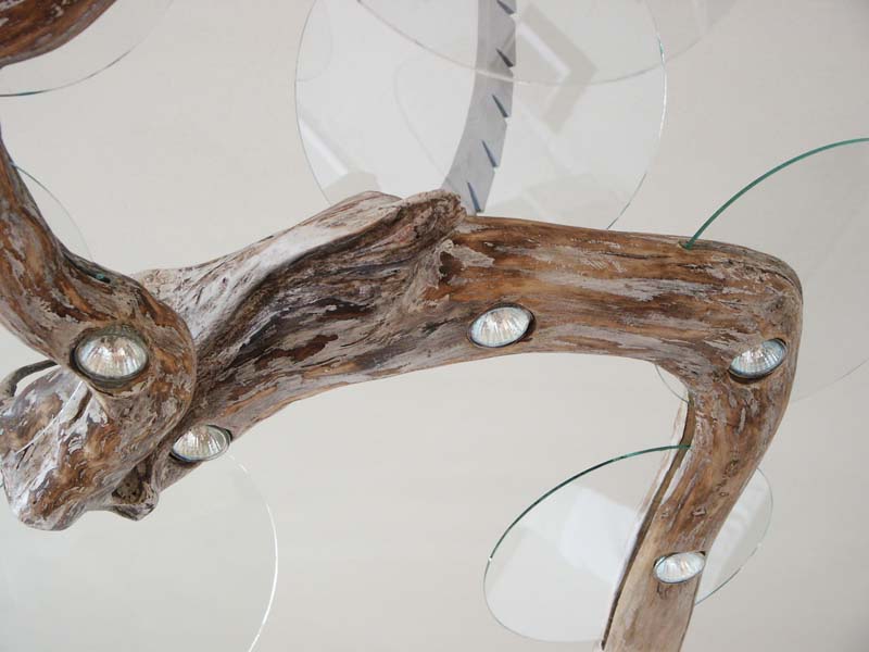 | Oltre ad illuminare l'ambiente il posizionamento dei faretti, strategicamente studiato ad arte, permette alla luce di essere trasmessa radialmente anche ai dischi di vetro. Illuminandone i bordi, i dischi prendono così forma, dando corposità all' opera finale ed esaltandone le varie differenze di cromaticità. |